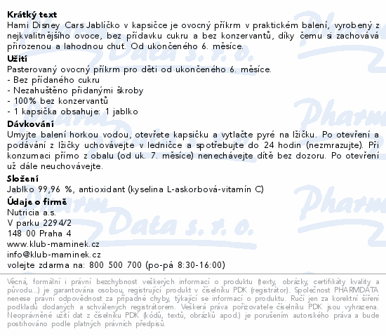 Hami Disney Cars Jablíčko v kapsičce je ovocný příkrm v praktickém balení, vyrobený z nejkvalitnějšího ovoce, bez přídavku cukru a bez konzervantů, díky čemu si zachovává přirozenou a lahodnou chuť. Od ukončeného 6. měsíce.