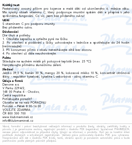 Pasterovaný ovocný příkrm pro kojence a malé děti od ukončeného 6. měsíce věku. Má vysoký obsah vitamínu C, který podporuje imunitní systém dětí a přispívá k jeho správnému fungování. Co víc, jsem bez přidaného cukru!