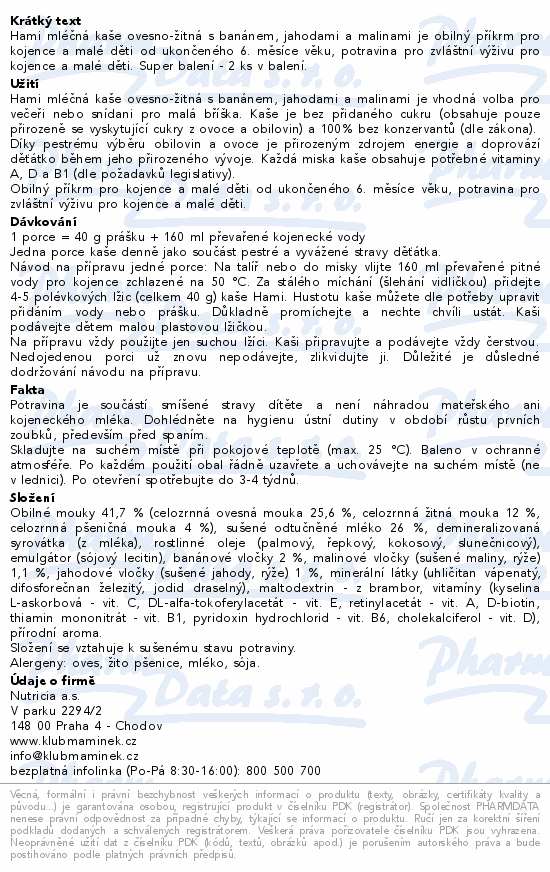 Hami mléčná kaše ovesno-žitná s banánem, jahodami a malinami je obilný příkrm pro kojence a malé děti od ukončeného 6. měsíce věku, potravina pro zvláštní výživu pro kojence a malé děti. Super balení - 2 ks v balení.