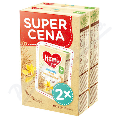 Hami mléčná kaše rýžová s vanilkovou příchutí je obilný příkrm pro kojence a malé děti od ukončeného 6. měsíce věku, potravina pro zvláštní výživu pro kojence a malé děti. Super balení - 2ks balení.