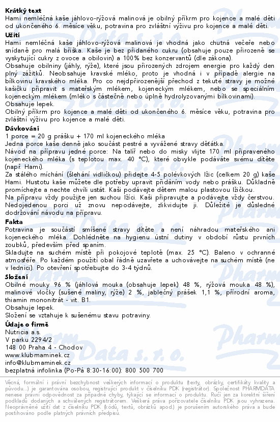 Hami nemléčná kaše jáhlovo-rýžová malinová je obilný příkrm pro kojence a malé děti od ukončeného 6. měsíce věku, potravina pro zvláštní výživu pro kojence a malé děti.