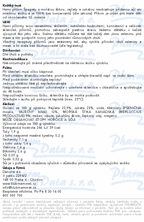 Hami příkrm Špagety s mořskou štikou, rajčaty a cuketou neobsahuje přidanou sůl ani mléčnou složku a je 100% bez konzervantů (dle zákona). Příkrm je určen pro malé děti od ukončeného 12. měsíce.