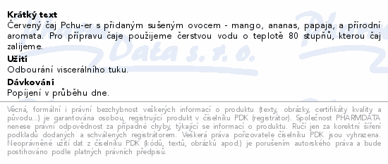 Červený čaj Pchu-er s přidaným sušeným ovocem - mango, ananas, papaja, a přírodní aromata. Pro přípravu čaje použijeme čerstvou vodu o teplotě 80 stupňů, kterou čaj zalijeme.