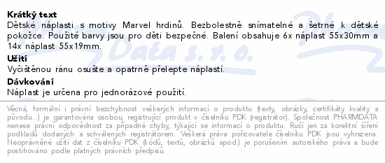 Dětské náplasti s motivy Marvel hrdinů. Bezbolestně snímatelné a šetrné k dětské pokožce. Použité barvy jsou pro děti bezpečné. Balení obsahuje 6x náplast 55x30mm a 14x náplast 55x19mm.