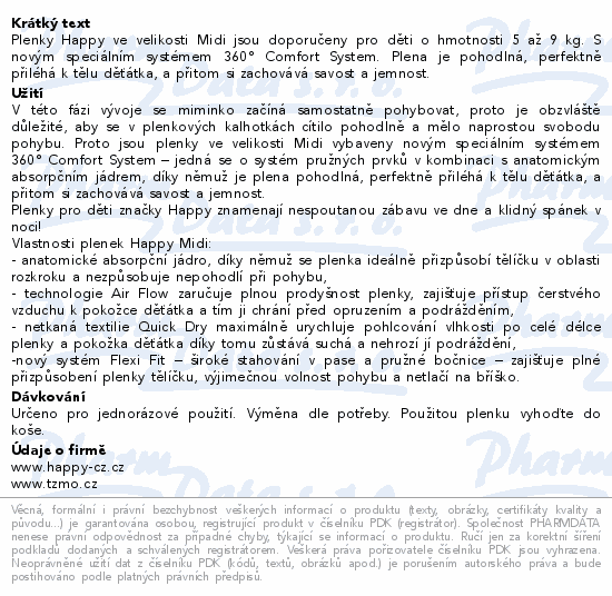 Plenky Happy ve velikosti Midi jsou doporučeny pro děti o hmotnosti 5 až 9 kg. S novým speciálním systémem 360° Comfort System. Plena je pohodlná, perfektně přiléhá k tělu děťátka, a přitom si zachovává savost a jemnost.