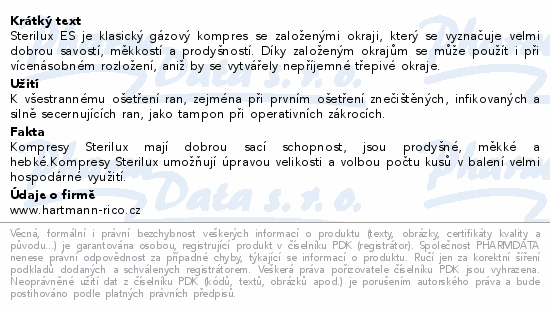 Sterilux ES je klasický gázový kompres se založenými okraji, který se vyznačuje velmi dobrou savostí, měkkostí a prodyšností. Díky založeným okrajům se může použít i při vícenásobném rozložení, aniž by se vytvářely nepříjemné třepivé okraje.