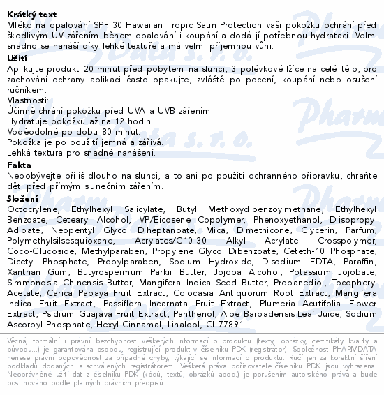 Mléko na opalování SPF 30 Hawaiian Tropic Satin Protection vaši pokožku ochrání před škodlivým UV zářením během opalování i koupání a dodá jí potřebnou hydrataci. Velmi snadno se nanáší díky lehké textuře a má velmi příjemnou vůni.