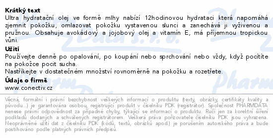 Ultra hydratační olej ve formě mlhy nabízí 12hodinovou hydrataci která napomáhá zjemnit pokožku, omlazovat pokožku vystavenou slunci a zanechává ji vyživenou a pružnou. Obsahuje avokádový a jojobový olej a vitamín E, má příjemnou tropickou vůni.