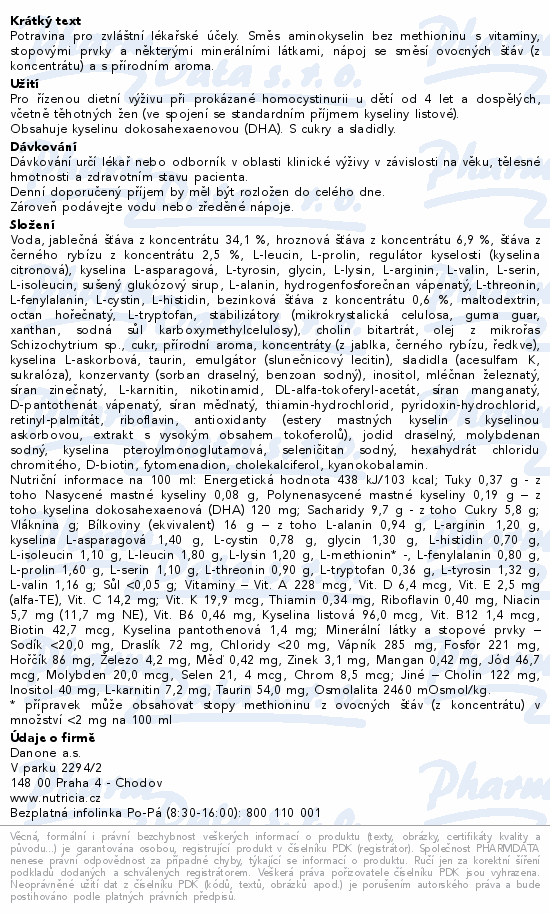 Potravina pro zvláštní lékařské účely. Směs aminokyselin bez methioninu s vitaminy, stopovými prvky a některými minerálními látkami, nápoj se směsí ovocných šťáv (z koncentrátu) a s přírodním aroma.