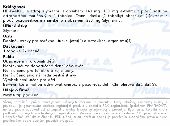 HE-PANOL je zdroj silymarinu s obsahem 140 mg. 180 mg extraktu z plodů rostliny ostropestřec mariánský v 1 tobolce. Denní dávka (2 tobolky) obsahuje: (1)extrakt z plodů ostropestřce mariánského s obsahem 280 mg Silymarinu.