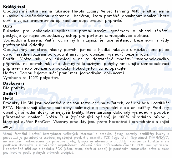 Oboustranná ultra jemná rukavice He-Shi Luxury Velvet Tanning Mitt je ultra jemná rukavice s voděodolnou ochrannou bariérou, která pomáhá dosáhnout opálení beze skvrn a zajistí rovnoměrnou aplikaci samoopalovacích přípravků.