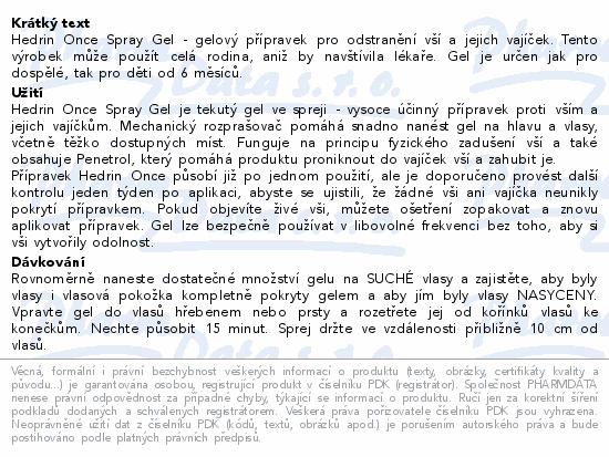 Hedrin Once Spray Gel - gelový přípravek pro odstranění vší a jejich vajíček. Tento výrobek může použít celá rodina, aniž by navštívila lékaře. Gel je určen jak pro dospělé, tak pro děti od 6 měsíců.