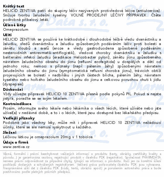 HELICID ZENTIVA patří do skupiny léčiv nazývaných protivředová léčiva (antiulceróza). Snižuje tvorbu žaludeční kyseliny. VOLNĚ PRODEJNÝ LÉČIVÝ PŘÍPRAVEK. Čtěte pozorně příbalový leták.