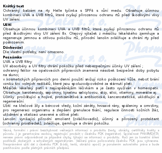 Ochranný balzám na rty Helle tyčinka s SPF6 s vůní medu. Obsahuje účinnou kombinaci UVA a UVB filtrů, které zvyšují přirozenou ochranu rtů před škodlivými vlivy UV záření.
