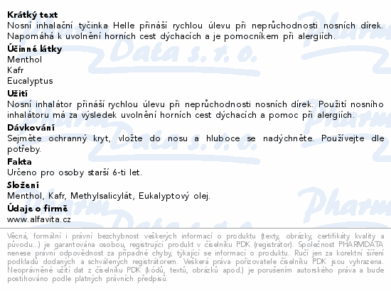 Nosní inhalační tyčinka Helle přináší rychlou úlevu při neprůchodnosti nosních dírek. Napomáhá k uvolnění horních cest dýchacích a je pomocníkem při alergiích.