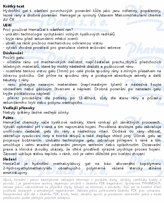 Hydrofilní gel k ošetření povrchových poranění kůže jako jsou odřeniny, popáleniny, řezné rány a drobná poranění. Hemagel je vyvinutý Ústavem Makromolekulární chemie AV ČR.