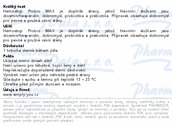 Hemostop Probio MAX je doplněk stravy, jehož hlavními složkami jsou diosmin/hesperidin, dobromysl, probiotika a prebiotika. Přípravek obsahuje dobromysl pro pevné a pružné cévní stěny.