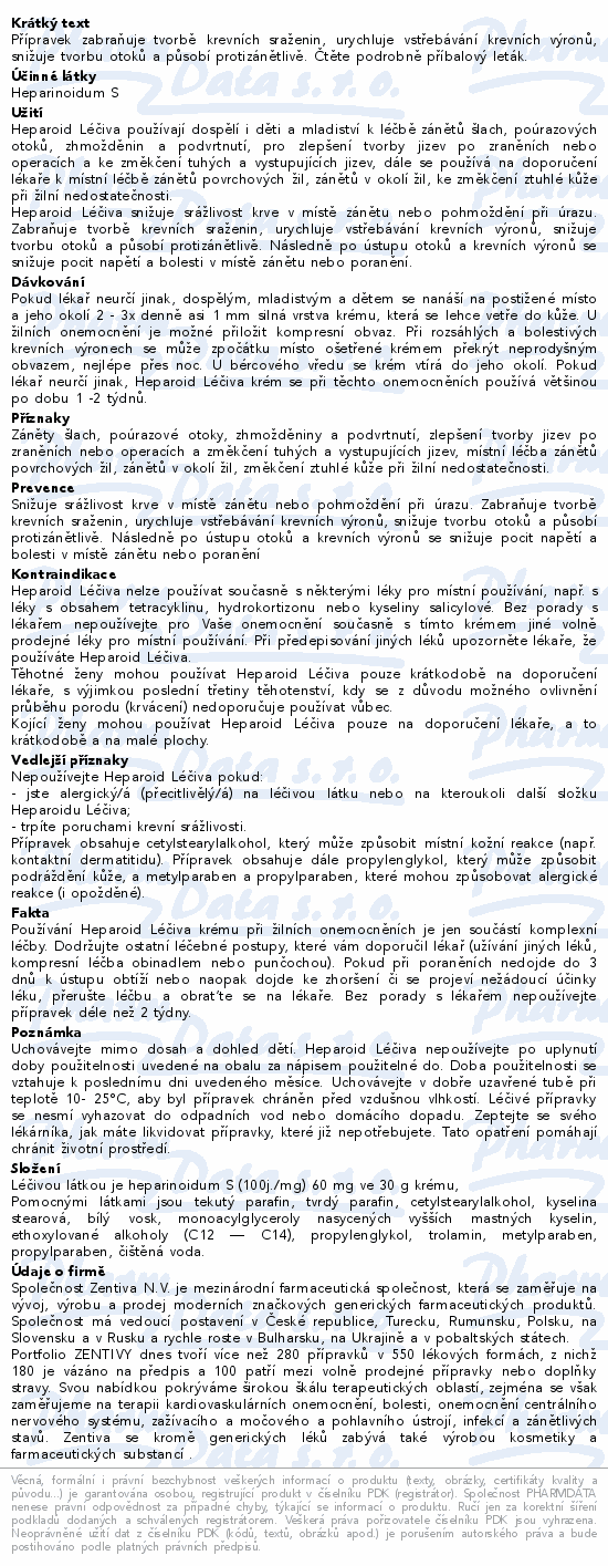 Přípravek Heparoid Léčiva krém je lokální antikoagulační preparát (přípravek tlumící krevní srážlivost), který po aplikaci na kůži zmírňuje bolesti a záněty, navíc podporuje hojení zánětů žil včetně bércových vředů a změkčuje ztuhlou kůži při žilní nedostatečnosti. Používá se ke zlepšení krevního oběhu po podlitinách (včetně hematomu) nebo poranění měkkých tkání, včetně poranění svalů, šlach, kloubního pouzdra a vazů; post-traumatických otoků (otoků po zranění nebo úrazu), kdy urychluje vstřebávání krevních výronů, snižuje tvorbu otoků. Následně po ústupu otoků a krevních výronů se snižuje pocit napětí a bolesti v místě zánětu nebo poranění. Dále se používá ke zlepšení tvorby jizev po zraněních nebo operacích a ke změkčení tuhých a vystupujících jizev.