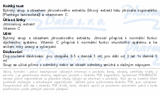 Bylinný sirup s obsahem jitrocelového extraktu (lihový extrakt listu jitrocele kopinatého (Plantago lanceolata)) a vitaminem C.