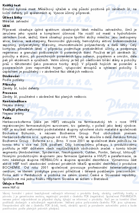 Emulzní bylinná mast. Měsíčkový výtažek a olej působí pozitivně při zánětech žil, na kožní defekty, při spáleninách aj. Vysoce účinný přípravek.