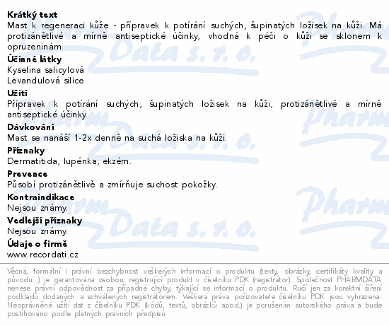 Mast k regeneraci kůže - přípravek k potírání suchých, šupinatých ložisek na kůži. Má protizánětlivé a mírně antiseptické účinky, vhodná k péči o kůži se sklonem k opruzeninám.