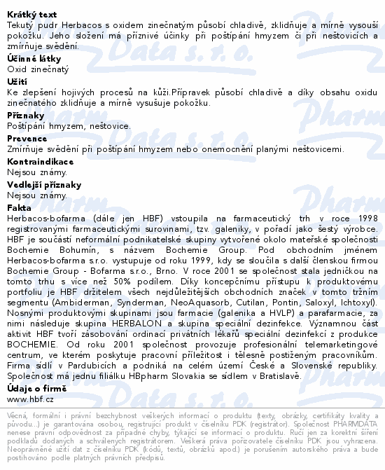 Tekutý pudr Herbacos s oxidem zinečnatým působí chladivě, zklidňuje a mírně vysouší pokožku. Jeho složení má příznivé účinky při poštípání hmyzem či při neštovicích a zmírňuje svědění.