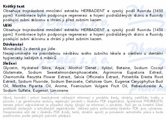 Obsahuje trojnásobné množství extraktu HERBADENT a vysoký podíl fluoridu (1450 ppm). Kombinace bylin podporuje regeneraci a hojení podrážděných sliznic a fluoridy posilující zubní sklovinu a chrání ji před zubním kazem.