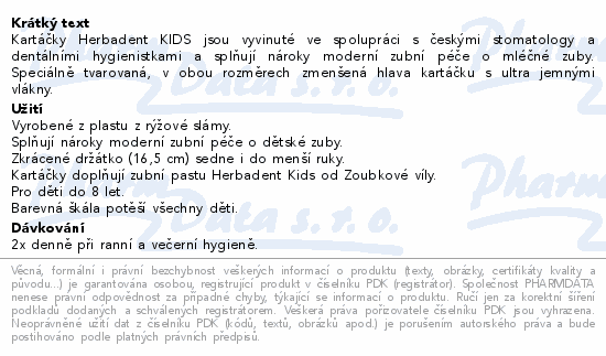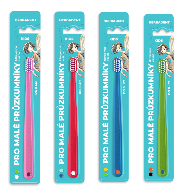 Kartáčky Herbadent KIDS jsou vyvinuté ve spolupráci s českými stomatology a dentálními hygienistkami a splňují nároky moderní zubní péče o mléčné zuby. Speciálně tvarovaná, v obou rozměrech zmenšená hlava kartáčku s ultra jemnými vlákny.