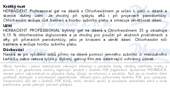HERBADENT Professional gel na dásně s Chlorhexidinem je určen k péči o dásně a sliznice dutiny ústní. Je vhodný při výskytu aftů i při projevech parodontózy. Chlorhexidin snižuje růst bakterií a tvorbu zubního plaku a omezuje zánětlivost dásní.