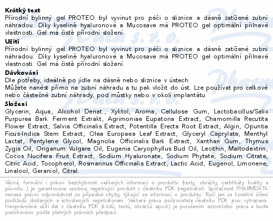 Přírodní bylinný gel PROTEO byl vyvinut pro péči o sliznice a dásně zatížené zubní náhradou. Díky kyselině hyaluronové a Mucosave má PROTEO gel optimální přilnavé vlastnosti. Gel má čistě přírodní složení.