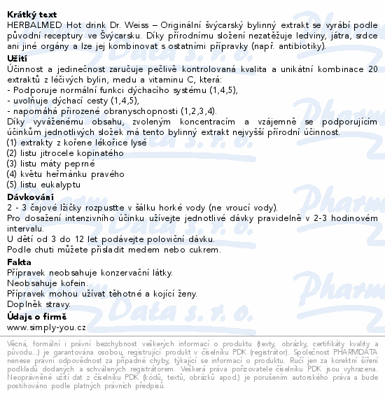 HERBALMED® Hot drink Dr. Weiss obsahuje unikátní kombinaci více než 20 extraktů z léčivých bylin. Díky přírodnímu složení nezatěžuje ledviny, játra, srdce ani jiné orgány. HERBALMED® Hotdrink je tak možné kombinovat s ostatními přípravky (vhodné např. jako doplněk při užívání antibiotik). Neobsahuje kofein. Tento doplněk stravy mohou užívat těhotné a kojící ženy.