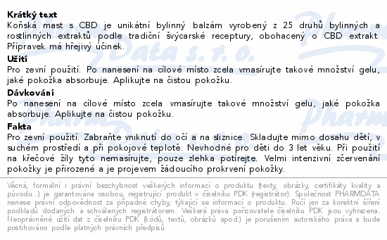 Koňská mast s CBD je unikátní bylinný balzám vyrobený z 25 druhů bylinných a rostlinných extraktů podle tradiční švýcarské receptury, obohacený o CBD extrakt. Přípravek má hřejivý účinek.