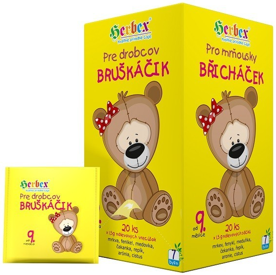 Herbex Břicháček Pro mrňousky je porcovaný čaj pro děti od 9.měsíce. Fenykl, meduňka a čekanka podporují trávení.