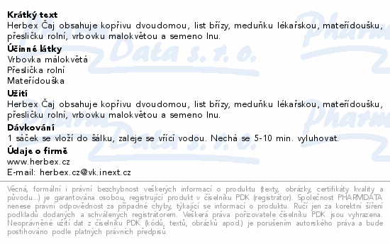 Herbex Čaj obsahuje kopřivu dvoudomou, list břízy, meduňku lékařskou, mateřídoušku, přesličku rolní, vrbovku malokvětou a semeno lnu.