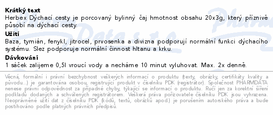 Herbex Dýchací cesty je porcovaný bylinný čaj hmotnost obsahu 20x3g, který příznivě působí na dýchací cesty.