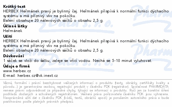 HERBEX Heřmánek pravý je bylinný čaj. Heřmánek přispívá k normální funkci dýchacího systému a má příznivý vliv na pokožku. Balení obsahuje 20 nálevových sáčků o obsahu 2,5 g.
