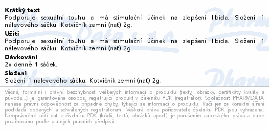 Podporuje sexuální touhu a má stimulační účinek na zlepšení libida. Složení 1 nálevového sáčku: Kotvičník zemní (nať) 2g.
