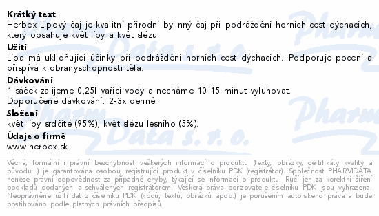 Herbex Lipový čaj je kvalitní přírodní bylinný čaj při podráždění horních cest dýchacích, který obsahuje květ lípy a květ slézu.