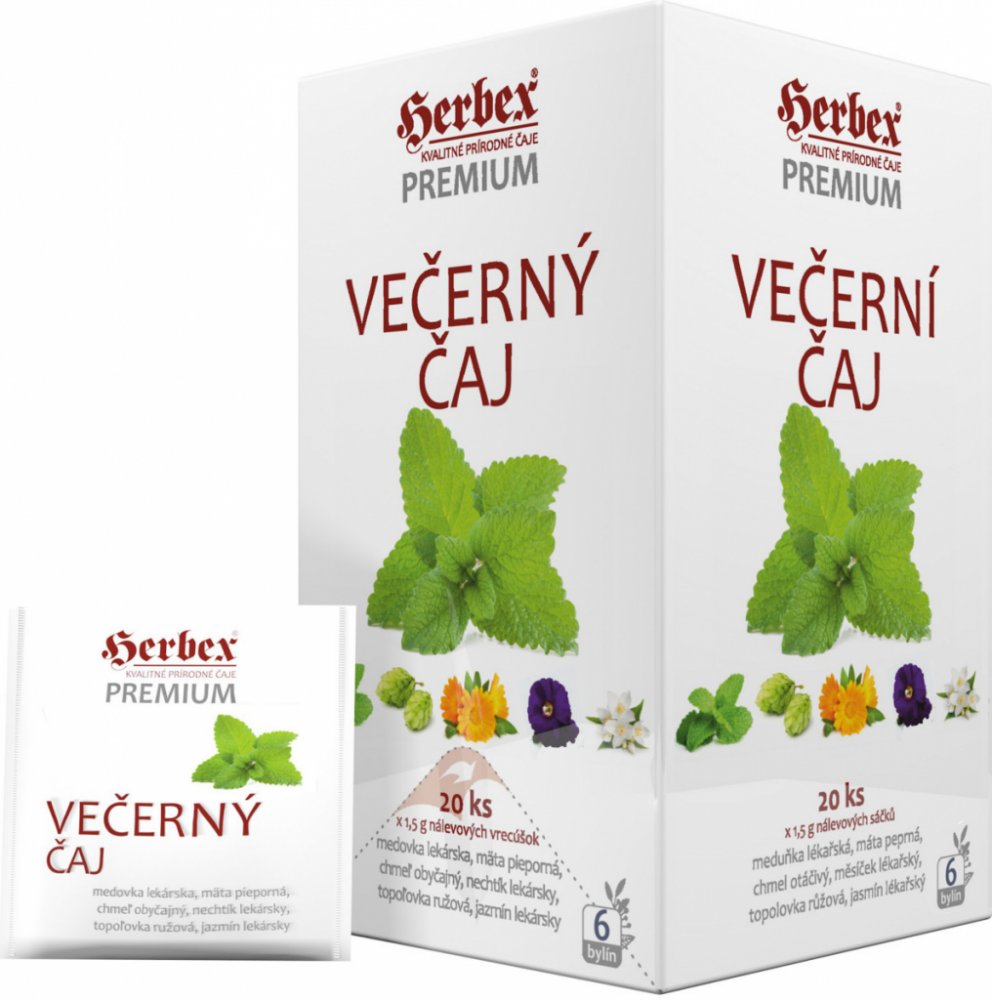 Herbex Premium je kvalitní přírodní bylinný večerní čaj, který obsahuje meduňka lékařská, máta peprná, chmel otáčivý, měsíček lékařský, topolovka růžová, jasmín lékařský.