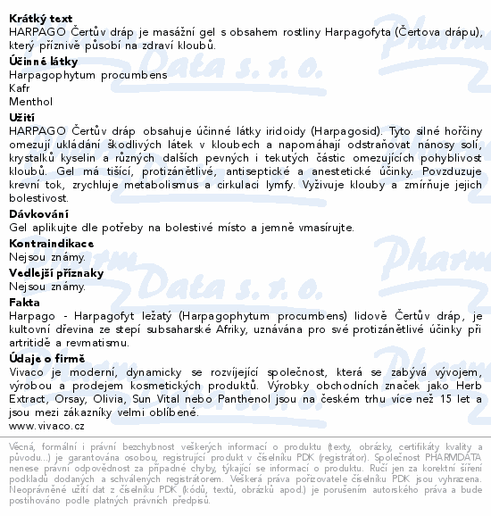 HARPAGO Čertův dráp je masážní gel s obsahem rostliny Harpagofyta (Čertova drápu), který příznivě působí na zdraví kloubů.