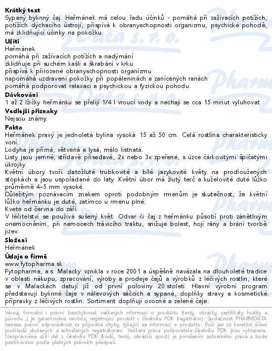 Sypaný bylinný čaj. Heřmánek má celou řadu účinků - pomáhá při zažívacích potížích, potížích dýchacího ústrojí, přispívá k obranyschopnosti organizmu, psychické pohodě, má zklidňující účinky na pokožku.