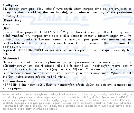 Aby byl účinek léčby co nejlepší, je důležité ji zahájit ihned, jakmile se objeví první příznaky, tj. pocit napětí, pálení nebo píchání v místech, kde později dojde k výsevu oparu. Již tehdy naneste malé množství přípravku HERPESIN KRÉM na postižené místo 5krát denně ve 4 hodinových intervalech s vynecháním noční dávky. Léčba trvá 5 (výjimečně až 10) dní. Hojení probíhá zpravidla velmi rychle, pokračujte však v nanášení krému alespoň 3 dny po vyhojení oparu.