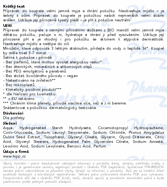 Přípravek do koupele velmi jemně myje a chrání pokožku. Neobsahuje mýdlo – je šetrný k očím. Přípravek do koupele je pokožkou našich nejmenších velmi dobře snášen. Udržuje její přirozeně kyselý plášť – je pH k pokožce neutrální.