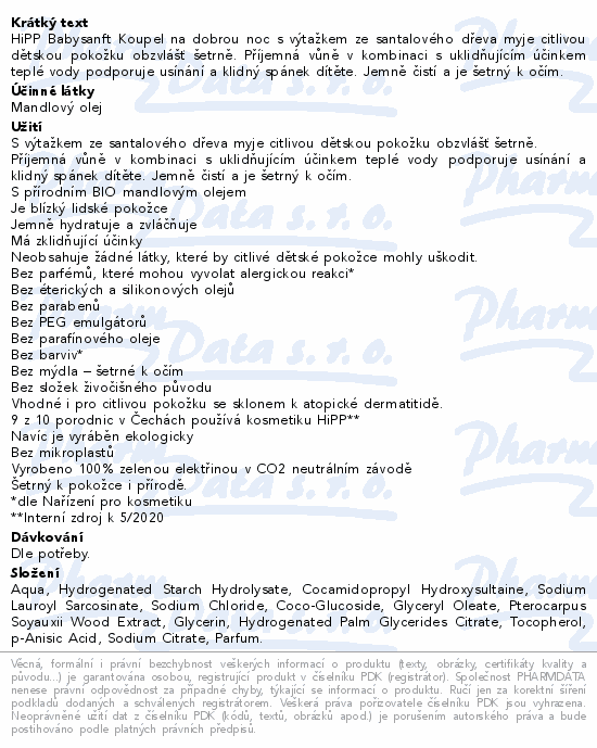 HiPP Babysanft Koupel na dobrou noc s výtažkem ze santalového dřeva myje citlivou dětskou pokožku obzvlášť šetrně. Příjemná vůně v kombinaci s uklidňujícím účinkem teplé vody podporuje usínání a klidný spánek dítěte. Jemně čistí a je šetrný k očím.