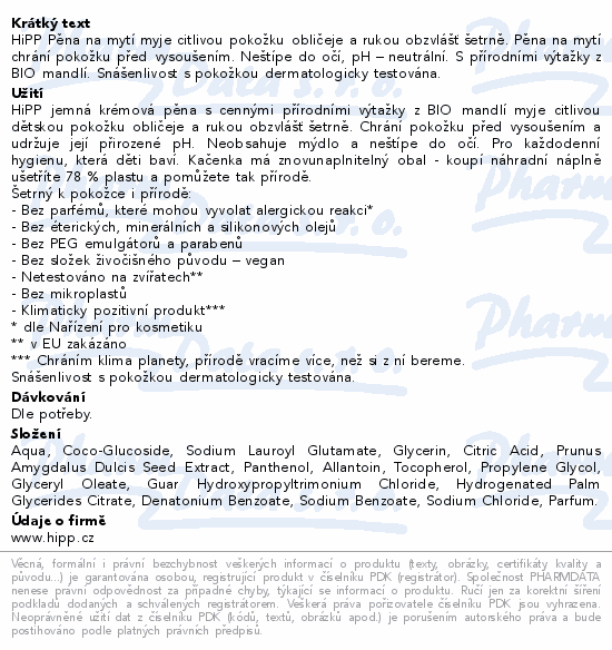 HiPP Pěna na mytí myje citlivou pokožku obličeje a rukou obzvlášť šetrně. Pěna na mytí chrání pokožku před vysoušením. Neštípe do očí, pH – neutrální. S přírodními výtažky z BIO mandlí. Snášenlivost s pokožkou dermatologicky testována.