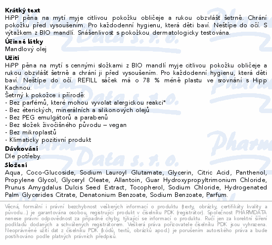 HiPP pěna na mytí myje citlivou pokožku obličeje a rukou obzvlášť šetrně. Chrání pokožku před vysoušením. Pro každodenní hygienu, která děti baví. Neštípe do očí. S výtažkem z BIO mandlí. Snášenlivost s pokožkou dermatologicky testována.