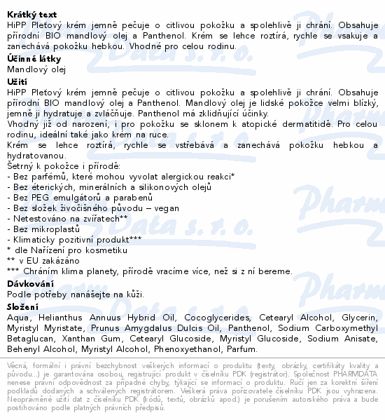 HiPP Pleťový krém jemně pečuje o citlivou pokožku a spolehlivě ji chrání. Obsahuje přírodní BIO mandlový olej a Panthenol. Krém se lehce roztírá, rychle se vsakuje a zanechává pokožku hebkou. Vhodné pro celou rodinu.