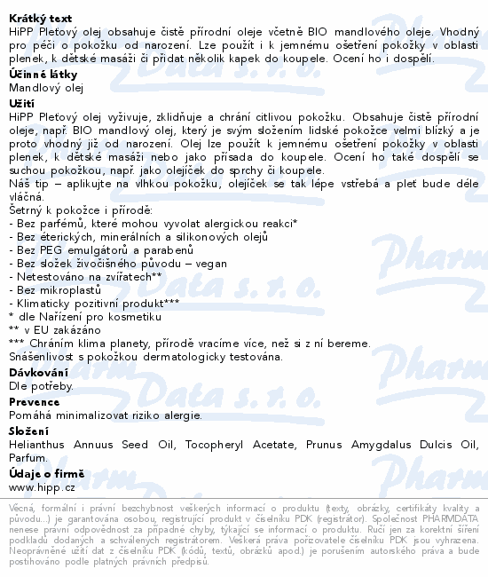 HiPP Pleťový olej obsahuje čistě přírodní oleje včetně BIO mandlového oleje. Vhodný pro péči o pokožku od narození. Lze použít i k jemnému ošetření pokožky v oblasti plenek, k dětské masáži či přidat několik kapek do koupele. Ocení ho i dospělí.