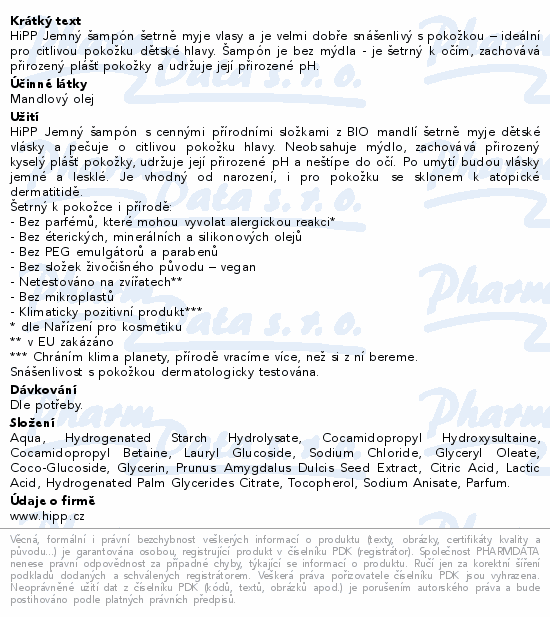 HiPP Jemný šampón šetrně myje vlasy a je velmi dobře snášenlivý s pokožkou – ideální pro citlivou pokožku dětské hlavy. Šampón je bez mýdla - je šetrný k očím, zachovává přirozený plášť pokožky a udržuje její přirozené pH.