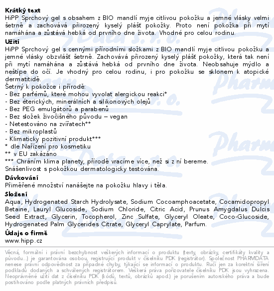HiPP Sprchový gel s obsahem z BIO mandlí myje citlivou pokožku a jemné vlásky velmi šetrně a zachovává přirozený kyselý plášť pokožky. Proto není pokožka při mytí namáhána a zůstává hebká od prvního dne života. Vhodné pro celou rodinu.